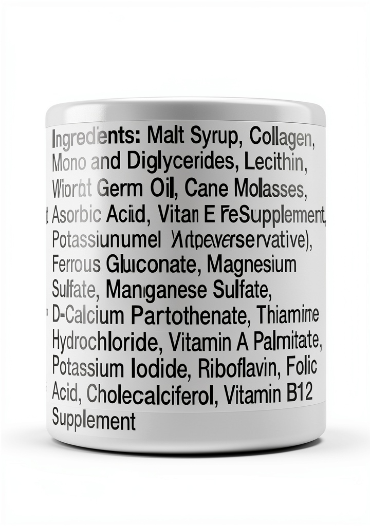 Key ingredients include malt syrup, collagen, canola oil, cod liver oil, Taurine, and vitamins like A and E for comprehensive health support.